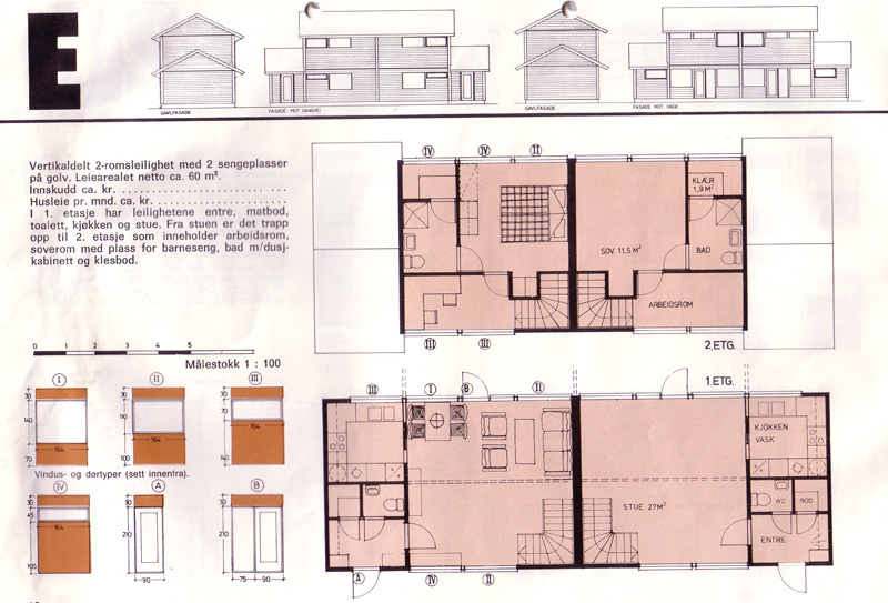 I 1. etasje har leilighetene entre, matbod, toalett, kjøkken og stue. Fra stuen er det trapp opp til 2. etasje som inneholder arbeidsrom, soverom med plass for barneseng, bad m/dusjkabinett og klesbod.